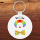 Erstellen Sie Ihren eigenen personalisierten Clown-Schlüsselanhänger. Es zeigt einen Clown mit einer regenbogenfarbenen Perücke, einer roten Clownase und einer gelben Polka Dotbow-Krawatte und ist bereit, mit einem Namen oder einem anderen benutzerdefinierten Text angepasst zu werden. Ein großartiges Gastgeschenk für clownthematische Geburtstagsfeiern.