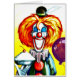 Eine Acrylmalerei eines glücklichen Clowns, der eine Sahnetorte und einen lila Ballon hält.