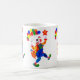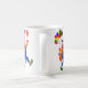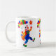 Eine hochwertige weiße Tasse mit handgemalteter Papiercollage-Gestaltung eines Jolly Clowns mit Ballons und einem wirbelnden Stern. Siehe auch passende Grußkarte, Geschenke und Kleidung. Geschirrspüler und Mikrowelle sicher und in zwei Größen erhältlich.