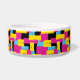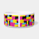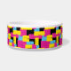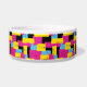 Ein gewagtes, helles, geometrisches, farbiges Blockmuster mit mehrschichtigen, texturierten, grausamen Farbrechtecken und Quadraten in Cyan, Magenta und Gelb vor schwarzem Hintergrund.