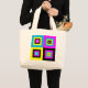 Grafik Designer CMYK Monogram Große Tote Bag, zeigt geometrische Quadrate Muster in den Farben Cyan, Magenta, Gelb und Schwarz (Schlüssel). In der Mitte jedes kleinen Platzes ist ein KUNSTBARes MONOGRAMM, das Sie durch Ihren ersten ersetzen können. Ideal für CMYK-Liebhaber, Grafiker und die Farbkreative in Ihrem Leben.