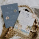 Mit dieser zweiseitigen Aquarelleinladung von Redwood & Vine Design Co. präsentiert die Front handbemalte Kunstwerke von Palmen, Ozeanwellen, Sandküste, goldener Sonne und Surfbrettern. Auf der Rückseite finden Sie einen staubigen blauen Hintergrund mit tropischen Illustrationen, Geschenkregisterdetails und einen scannbaren QR-Code für den einfachen Zugang zum Internet Registern. Ideal für einen tropischen, Strand oder eine Surf-inspiriert Feier, verbindet diese Einladung natürliche Schönheit mit praktischen Details für eine vollständige und elegante Präsentation.