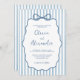 This dusty blue and white whimsical coastal wedding invitation features a hand drawn scalloped frame with a bow on a background of watercolor stripes, and handwriting script.