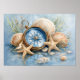 Bring a calm nautical focal point to your space with this Coastal Compass Starfish Wall Art Print. The ocean blue compass rose, warm sand tones, and seashell accents pair perfectly with coastal living rooms, beach bedrooms, and lake house decor. A clean, classic piece for a gallery wall, entryway, or above-the-sofa statement print.