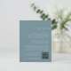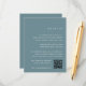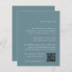 Diese staubige blaue Hochzeitskarte aus der Sammlung Low Tide von Navy Road Creative ist eine elegante und moderne Art, Reisen, Unterkünfte und Registrierungsinformationen zu teilen. Mit einem sauberen weißen Text und einem scannbaren QR-Code ist es ideal für Hochzeiten an der Küste und am Ziel.