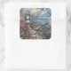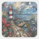 Aufkleber am Ufer des Leuchtturms. © Radenbrea Studios bei Zazzle. Aufkleber mit Meereslandschaft, Leuchtturm, Liegestuhl und Blume.