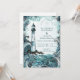This coastal wedding design features a hand-illustrated lighthouse rising above dramatic ocean waves, framed by flowing watercolor textures in soft teal, seafoam, and deep blue tones. The composition blends nautical romance with an elegant, storybook feel, creating a striking yet refined seaside aesthetic.
