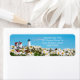 Coastal Nubble Light Summer Daisy Maine Lighthouse Return Label. Schöne Makrofotografie mit einem Garten mit Montauker Gängen und Monarchschmetterlingen im Leuchtturm Nubble. Dieses flache Naturfoto erfasst einen Schmetterling scharf mit einem weichen Fokus auf den entfernten Leuchtturm.