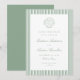 Set the tone for your wedding with this sage green wedding save the date, featuring a hand-drawn seashell illustration at the top and a classic striped border. The couple’s names are displayed in elegant calligraphy script, with the wedding date and location arranged below in classic serif lettering. This design is a great choice for beach weddings, seaside ceremonies, and destination weddings, offering a refined take on nautical-inspired wedding stationery. The back features space for a wedding website, photos, or additional wedding details.