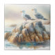 This serene coastal illustration captures two seagulls poised atop a sun-washed rocky cliff, overlooking calm, rippling water. Rendered in a soft watercolor style, the scene feels airy and peaceful, with gentle brush textures that blend stone, sea, and sky into a harmonious composition. Muted blues, sandy beiges, misty grays, and hints of seafoam create a soothing pastel color story that evokes quiet mornings by the shore. The overall mood is tranquil and reflective, balancing natural realism with a slightly whimsical, painterly touch. This artwork carries a cozy coastal charm, blending folk and cottagecore influences with an open, breezy atmosphere that feels timeless and calming. AI generated artwork.