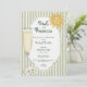 This whimsical coastal petals and prosecco bridal shower invitation features a vintage sun motif, lace border, palm trees, and stylish sage green stripe background. Perfect for a beach or California destination wedding theme event. Created by Simply Farmhouse Press.