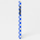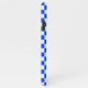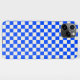 A blue and white checkerboard pattern with alternating squares fills the image, creating a geometric, balanced design with a classic, symmetrical feel.