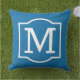 Stilvolles und klassisches quadratisches Kissen mit Akzenten im Außenbereich mit einem Monogramm-Initial mit einem schlichten dekorativen Rahmen in weißer Farbe mit kobaltblauer Hintergrundfarbe. Passen Sie den Hintergrund an, um sich mit Ihrer Außendekoration abzustimmen.