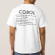 Die Front hat Edsger W. Dijkstras berühmtes Zitat über COBOL. Die Rückseite hat Multiplen Choice auf verschiedenen Bedeutungen für, welches COBOL für mit die Wahl steht (e), die "alles oben genannte" ist. Das Shirt ist entworfen, um Spaß bei COBOL zu stoßen, da es solch eine alte Computersprache ist und sie zu lernen gerade so hart und schwierig ist.