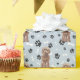 Ein Bild eines braunen Cockapoo-Hundes ist das Merkmal dieses jeden Anlasses Geschenkpapier. Der Hund sitzt inmitten eines Musters aus schwarzen Pfoten und weißen Knochen und wird auf einem silberblauen Hintergrund wiederholt.