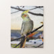 Foto eines bunten Cockatiel, der in einem Baum hockt.