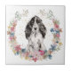 Diese Kachel zeigt ein Bild eines Kranzes in der Frühlingsfarbe in Weich-Rosa, Blau, Gold, Grün und Creme. In der Mitte befindet sich ein schönes Aquarellbild eines bezaubernden Cocker Spaniels. Die winzigen goldenen Konfetti geben dem Hintergrund ein subtiles Funkeln. Perfekt für alle, die einen Cocker Lieben!