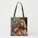 Golden Cocker Spaniel genießt einen friedlichen Urlaub auf der Zuhause am geschmückten Weihnachtsbaum.
