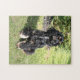 Dieses Puzzle hat ein Foto eines 18 Monate alten, reinrassigen, männlichen Cocker Spaniels, der aufrecht auf grünem Gras sitzt und hinter ihm einen immergrünen Baum hat.
