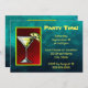 Generische Party Einladung. Ein zeichn eines Martini-Glases in einer dicken, schwarz gezeichneten Kontur, in Kalkgrün und Gelb gehalten. Limone Erholungen in Scheiben am Glasrand. Umgeben von einer doppelten Grenze von Gelb und Kalkgrün. Der Hintergrund der Illustration ist ein grunge Stil hell und dunkelrot. Der Hintergrund der Einladung ist eine grüne mattierte, gläserne Textur.