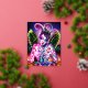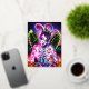 Das ist eine farbenfrohe, trippige, surreale Pop-Illustration eines Mädchens am Strand, das Cocktail oder Mocktail trinkt. Sie genießt heiße Sommervibes.