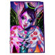 Das ist eine farbenfrohe, trippige, surreale Pop-Illustration eines Mädchens am Strand, das Cocktail oder Mocktail trinkt. Sie genießt heiße Sommervibes.