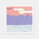 Diese Cocktails Napkins sind mit lila Bergen und einem blauen Ozean unter einem orangefarbenen Sonnenuntergang gestaltet.