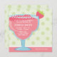Beginnen Sie Ihren Geburtstagsbash, Cocktail-Party oder Sommerfest im Stil, indem Sie diese schicken Party Einladungen mit einer modernen Vektorgrafik von gefrorenen Erdbeeren Margarita auf einem Polka-Punkt Hintergrund senden. Art © JW ILLUSTRATION