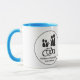 CODA-Tasse hat zwei logo'd Entwurf im Schwarzen auf einer weißen Schale mit blauem Griff und Kante.