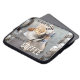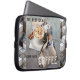 Laptop-Ärmel mit einem Kaffee auf einem metallischen Hintergrund mit Gebäude-Blöcken. Für einen guten Start in den Tag!