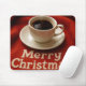 A steaming cup of black coffee rests on a white saucer against a red background, with the words "Merry Christmas" elegantly printed beneath