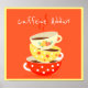 Coffeinsüchtige Zitat oder Slogan mit einer Retro-niedlichen Vintage-Abbildung von drei alten Teebechern im Retro-Stil, die auf einem hellen Orange-Hintergrund auf dem Trend aufgestapelt sind. Dieses skurrile Design ist für Tee- und Kaffeeliebhaber überall. Ideal für die Küchendekoration.