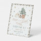 Die Niedliche Polar Bear Baby Dusche Welcome Pedestal Sign ist ein herzliches und charmantes Design, das sich perfekt für Winterfeiern eignet. Ein bezaubernder Eisbär liegt neben einem wunderschön dekorierten Weihnachtsbaum, der sowohl Wärme als auch Festlichkeit hervorruft. Die sanften Schneeflocken, die um den Bären und Baum fallen, schaffen eine zauberhafte Winterlandatmosphäre, die sich perfekt für eine Babydusche in den kalten Monaten eignet. Die moderne Schrift-Typografie fügt einen zeitgenössischen und stilvollen Flair hinzu, der die sanften Pastellfarben des Designs perfekt ergänzt. Die Kombination aus festlichen Details und niedlichen Eisbärenbildern wird ein Gefühl der Freude und Spannung für die besondere Ankunft wecken. Es ist eine perfekte Art, ein kleines zu feiern, das in der magischsten Jahreszeit in die Welt kommt. Matching-Elemente verfügbar.