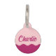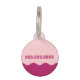 Pet ID Tag mit dem Namen Ihres Haustieres in Weiß auf einem hellrosa Hintergrund mit der Telefonnummer auf der Rückseite. Schriftart und Farben sind im Designwerkzeug anpassbar.