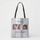 Personalisieren Sie diese Foto Collage Tote Tasche mit Ihren eigenen Fotos. Insgesamt sechs Fotos, drei vorne und drei weitere hinten. Familie ist.. Liebe & Lachen auf der Vorderseite Fun & Erinnerungen auf der Rückseite. Konzipiert mit weißen und grauen Streifen. Geschenkidee.