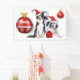 Eine bezaubernde Aquarell-Illustration einer schwarz-weißen Grenzkollie und ein englischer Setter, der dich mit einem Weihnachtshut anschaut. Sie sind gerahmt von festlich dekorativen roten Farbbandsträngen und zwei Weihnachtsbaumbaubels sowie einem hübschen, rot-weißen Sternengeschenk. Eine Vorlage für Ihren Weihnachtsgrüße erscheint über dem einen Baubel in einem extravaganten Schriftart mit weißer Kalligraphie. Diese sind ideal für Hundefreunde, Tierheime, Tierkliniken und Boarding-Zwinger.