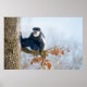 Inmitten der lebhaften Herbstfarben dringt ein Kobus-Affe hoch in die Bäume und verrät die Umgebung. Dieses arboreale Primat mit seinem unverwechselbaren Schwarzweißmantel und den goldenen Blätter verkörpert die ruhige Schönheit der Saison.