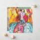Farbenfrohe, skurrile, lebendige Venezianische Maskenfigur. Eine ausgeklügelte Blondine sitzt mit einer Federmaske in Hand mit glitzernden goldfarbenen, silberfarbenen, blauen, aquamarinen Stoffen eines barocken Maskenballkostüms mit Federn und blumigen Glitzern in weiß, rosa, gelb .
