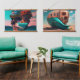 A skull head has been completely colored in an abstract style to bring you into the world of creativity and surreal design, in the style of photo-realistic landscapes, tropical landscapes, futuristic realism, pixelated realism, light crimson and sky-blue, surrealistic dreamscapes