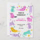 in various poses and colors like pink, teal, and yellow. Text reads, "Fern is turning 6! Join us for a 'paw-some' party!" Date and location details follow. Theme is joyful and whimsical.