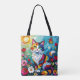 A sweet tote bag with a cute illustration of a colorful abstract cat surrounded by flowers, butterflies and the sun in a paper quilling impasto style.