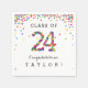 Maßgeschneiderte bedruckte Servietten mit Regenbogenfarben für eine Abschluss-Klasse von 2024. Mit Klasse von "24" in Konfetti, und Glückwunsch an den Grad mit lustigen bunten Konfetti Kreise, die um den Rand der Serviette gesprengt.