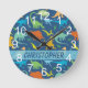 Farbenfrohe Dinosaurier-Silhouette, die Sie personalisieren und Ihren eigenen Namen hinzufügen können. Tyrannosaurus Rex, Titanosaurier, Triceratop, Raptoren, Ankylosauren, Dino-Birds, Stegosaurus, Apatosaurus, Pteranodon und mehr in einem farbenfrohen Muster in blauem Hintergrund, und Dinosaurier in grün, blau, gelb und orange.