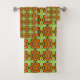 Colorful geometric mandala pattern in orange, green, and blue displayed hanging on a rod and flat on a surface, showing texture.