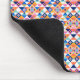 Colorful geometric pattern mouse pad with a vibrant mosaic design featuring blue, orange, and pink hues. An example image shows a white mouse on the pad.