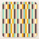 A colorful, geometric pattern with vertical stripes in teal, cream, peach, dark brown, and orange arranged in rows. The design conveys a retro, vibrant feel.