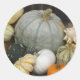 Rundkleber für Herbst und Halloween, die das Foto eines blauen Kürbis und andere bunte Squashsorten zeigen. Verwenden Sie auf Umschläge, Günstige Taschen, Schrottbuchung und vieles mehr. Wählen Sie Ihre Aufklebergröße aus.
