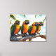 This is a beautiful parrots wildlife art design. Features four colorful macaw parrots on a tree limb with the ocean beach in background. It is on a stretched canvas wall art frame, ready to hang. Comes in many sizes. Great gift for that wildlife lover.