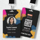 This sleek and modern business ID badge features a bold black background adorned with vibrant abstract shapes in pink, mustard yellow, and teal. Designed for professionals who want to make a statement, this badge combines functionality with contemporary aesthetics. It's perfect for employees, event staff, or anyone needing a stylish identification solution. The clean layout ensures essential information is easily visible, while the artistic accents add a unique touch of personality to your professional appearance.