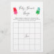 Mit dieser Bingo-Spielkarte können Sie sich bei Ihrer Babydusche amüsieren. Aquarellbilder von bunten Eiswürfeln. Das Bingospiel frage den Gästen zu erraten, welche Geschenke die Mama-to-be erhalten wird. Original Illustration und Design von Namibear Art Studio.